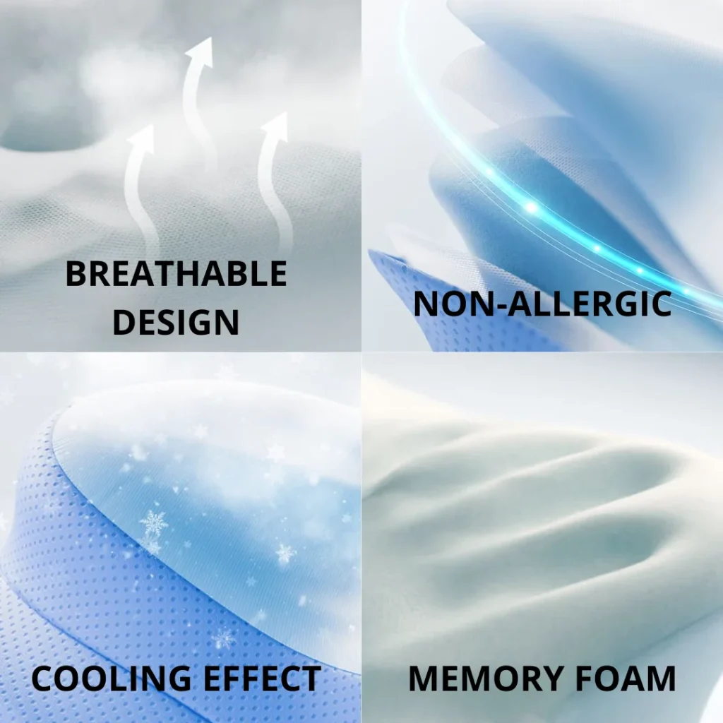 Its carefully crafted design — featuring a cervical support curve, cooling outer layer, and adaptive memory foam — helps minimize pressure, reduce discomfort, and support proper posture, whether you sleep on your back, side, or stomach.
